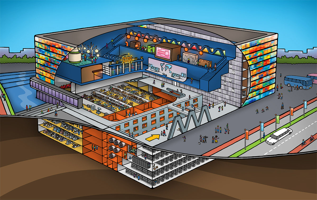 . Illustraties waar je goed op kan zien hoe het werkt of, zoals bij het gebouw van Beeld en Geluid, wáár je nu eigenlijk bent.
